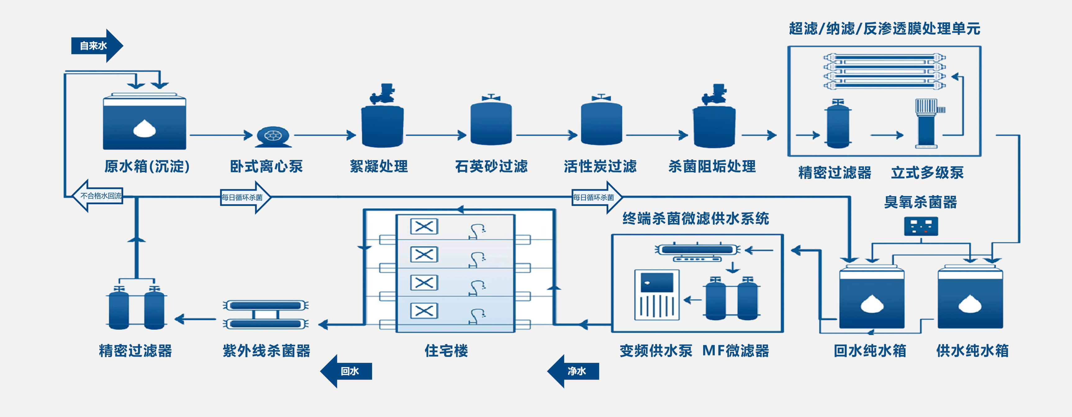 通过小区中央净水机房集中处理水质,经食品级专用管道直接输送至家庭终端,打开水龙头即可饮用,无需搬运或等待。系统采用同程循环设计与分户计量智能水表,24 小时循环杀菌确保水质稳定,避免管道内死水滋生细菌。用户可通过 APP 实时观测饮用水的余氯、PH 值、溶氧量等指标。