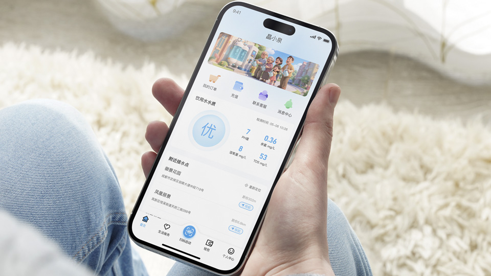云端平台联动 “晶小泉” APP,用户端智能化用水体验,管理端支持远程查看设备状态、调整参数,智能诊断模块提前预警维护需求,生成运维工单,降低故障率,减少运维成本。